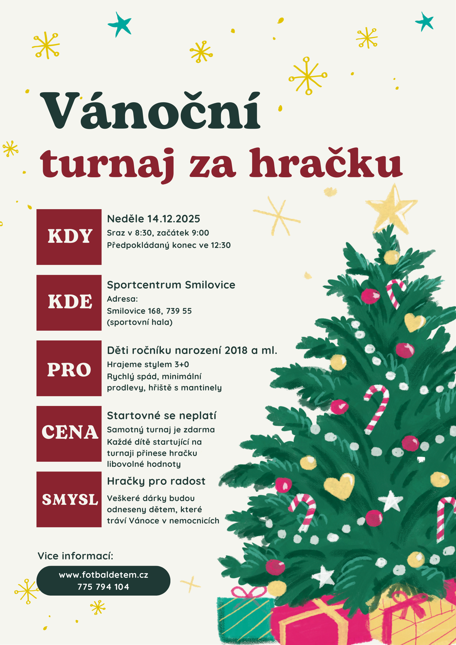 Turnaj byl určen pro malé fotbalisty (ročník 2018 a mladší), kteří sami za sebe přinesli libovolnou hračku. Další náklady spojené s organizací turnaje byly nulové.